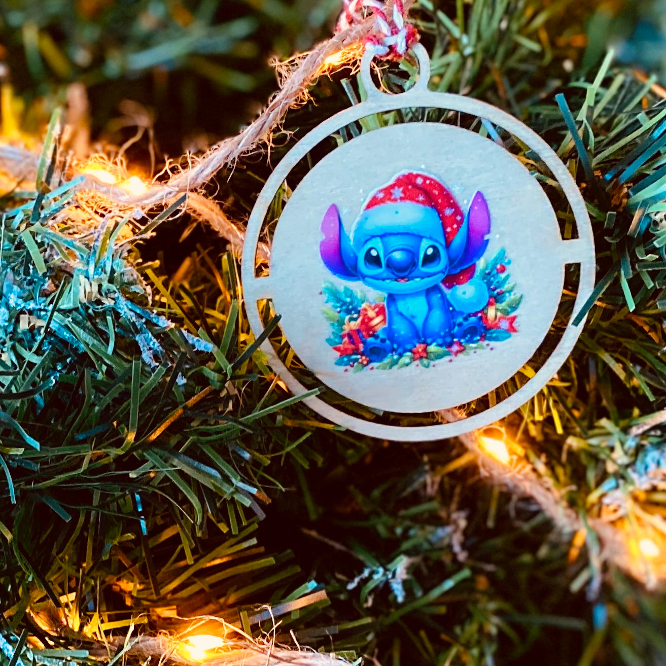 Boule Noël découpée au laser, ornée d'un sticker Stitch UV DTF et d'une fine gravure au dos.