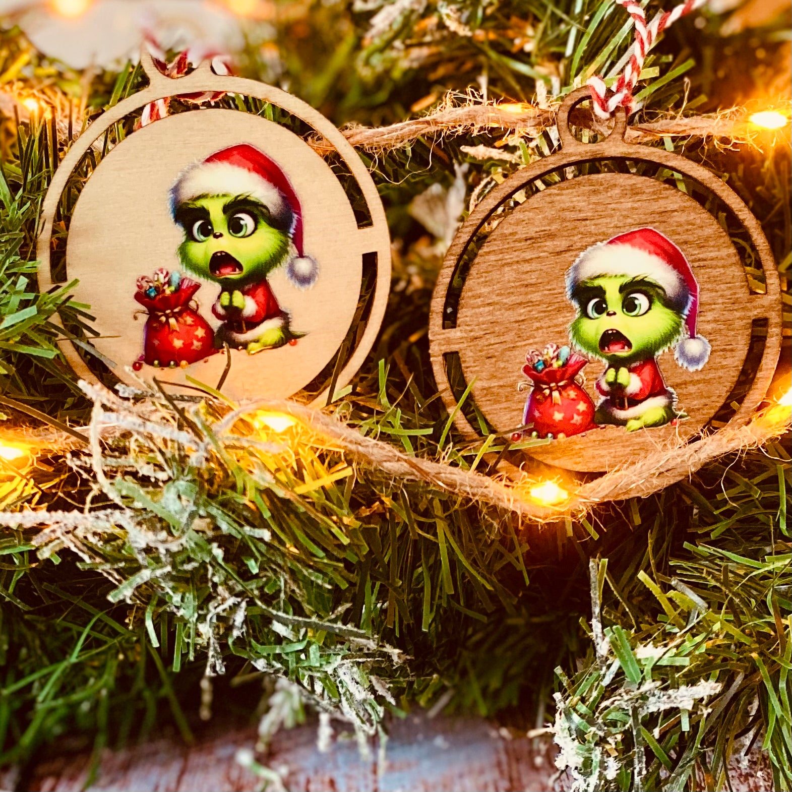 Boule Noël découpée au laser, ornée d'un sticker Grinch UV DTF