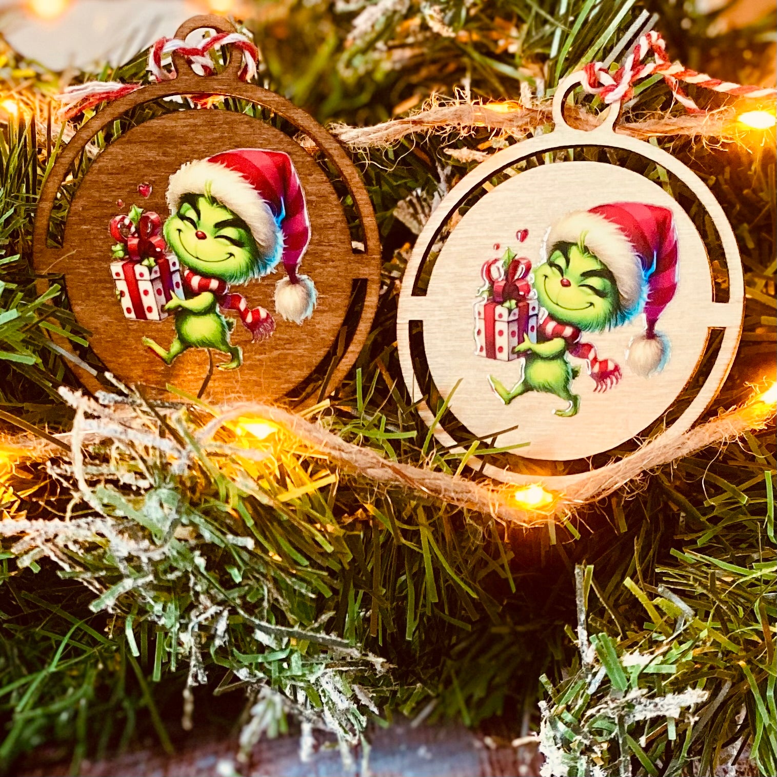 Boule Noël découpée au laser, ornée d'un sticker Grinch UV DTF