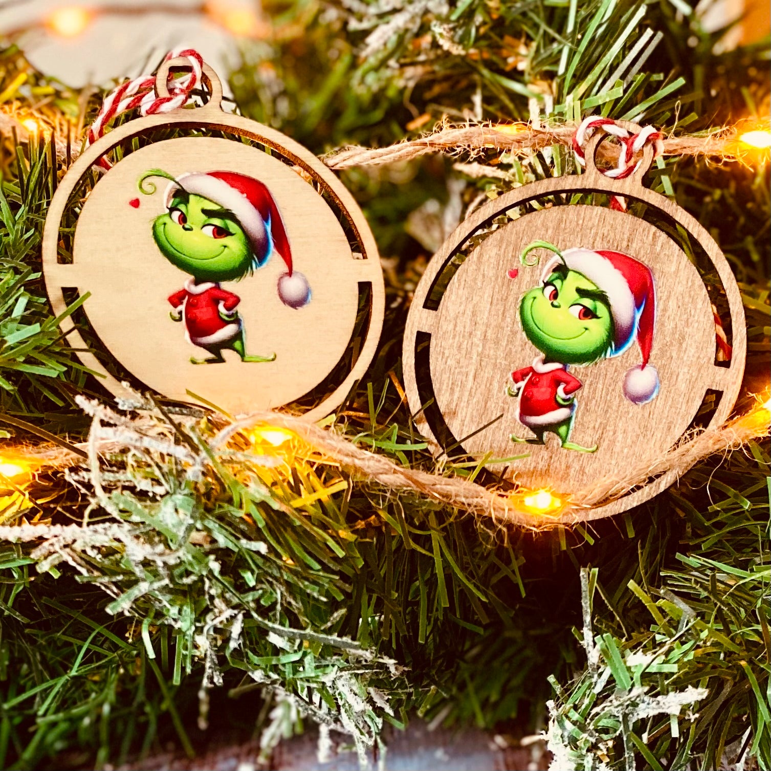 Boule Noël découpée au laser, ornée d'un sticker Grinch UV DTF