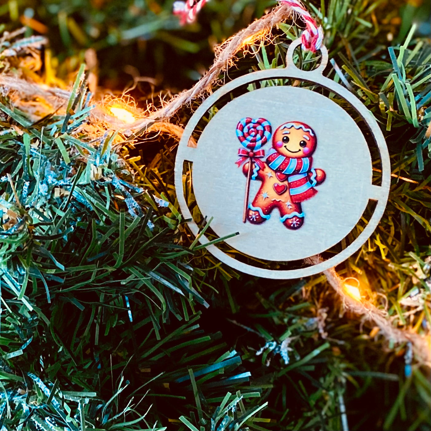 Boule Noël découpée au laser, ornée d'un sticker UV DTF et d'une fine gravure au dos.