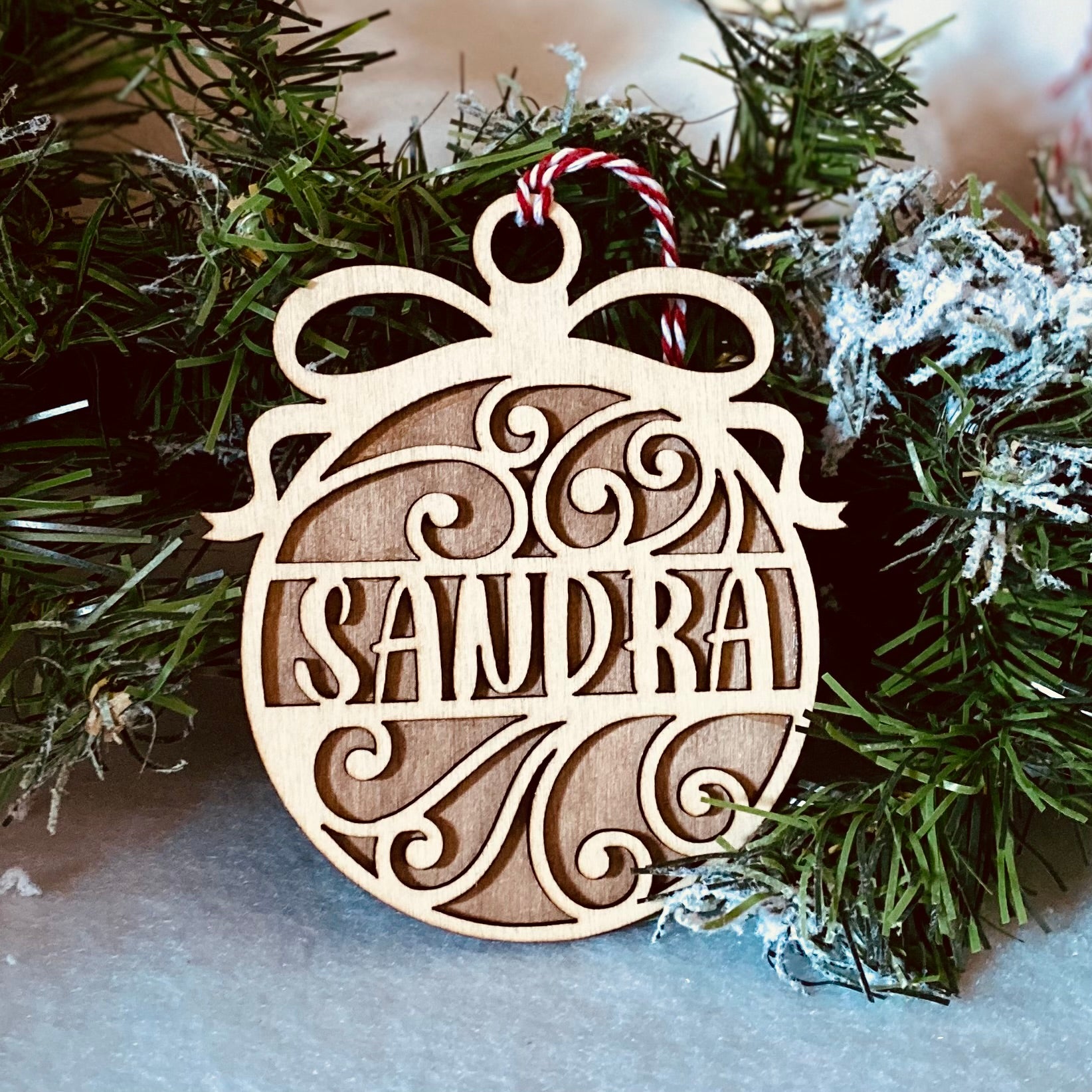 Découpée et gravée avec soin dans du bois, elle met en valeur le prénom de votre choix au cœur d’un élégant motif festif.