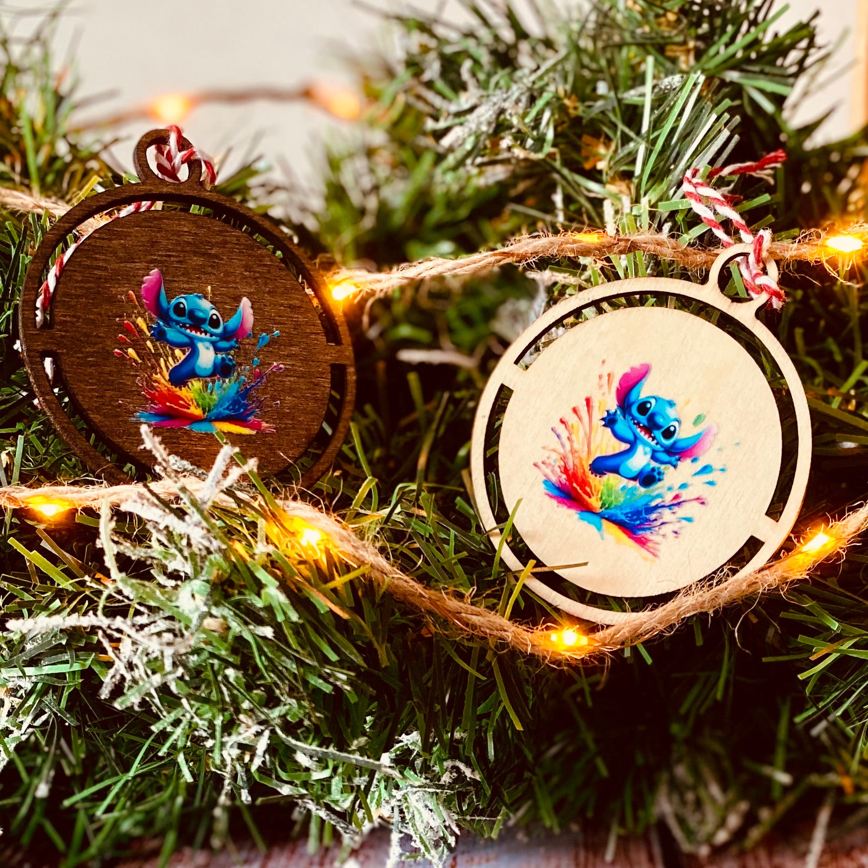 Boule Noël découpée au laser, ornée d'un sticker Stitch UV DTF