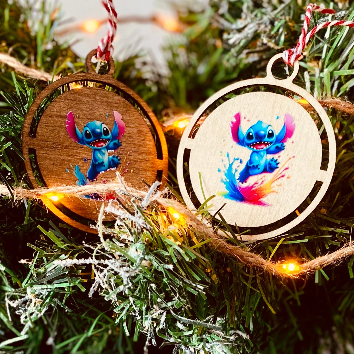 Boule Noël découpée au laser, ornée d'un sticker Stitch UV DTF