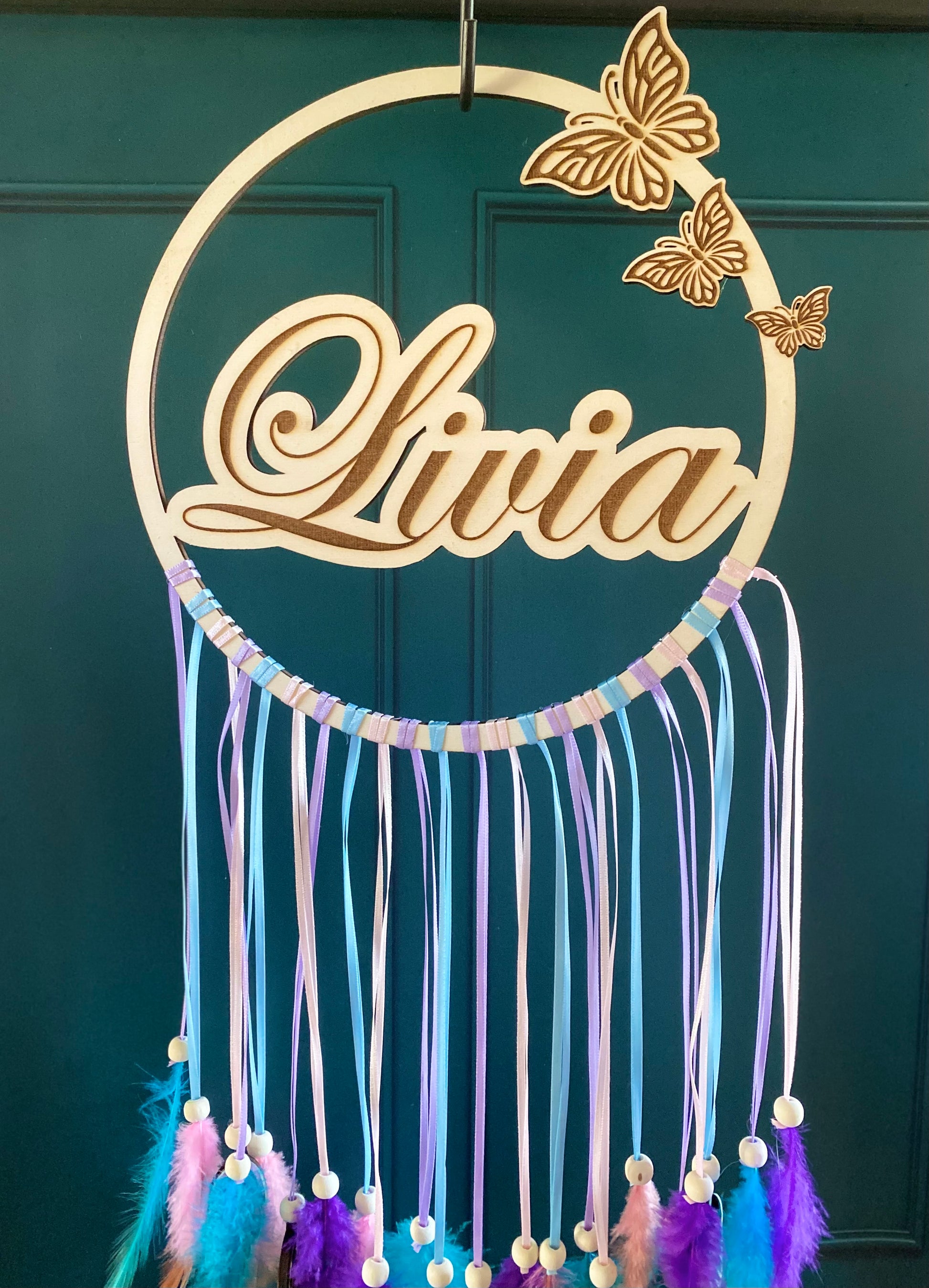 Vous pouvez personnaliser ce cercle en y ajoutant un prénom ainsi que des motifs gravés selon vos préférences. Les rubans colorés suspendus avec des plumes viendront ajouter une dimension magique et unique à votre création. Demandez nous les couleurs souhaitées et nous le faisons.