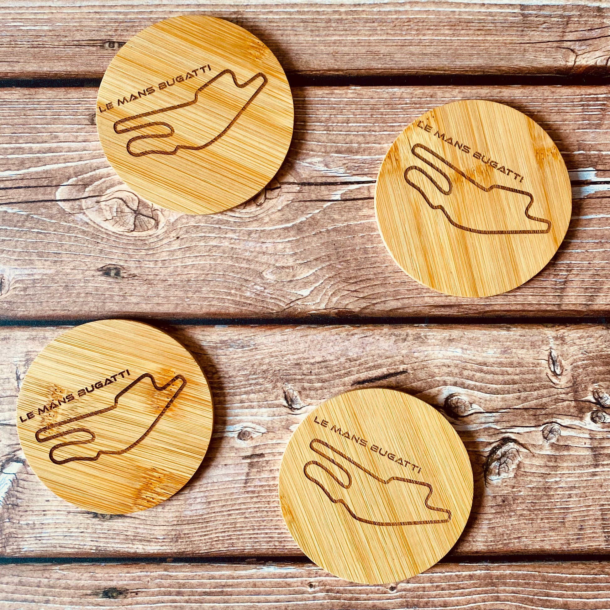 Ajoutez une touche de passion automobile à vos apéros avec ce lot de 4 dessous de verre en bambou gravés du circuit mythique Le Mans Bugatti.