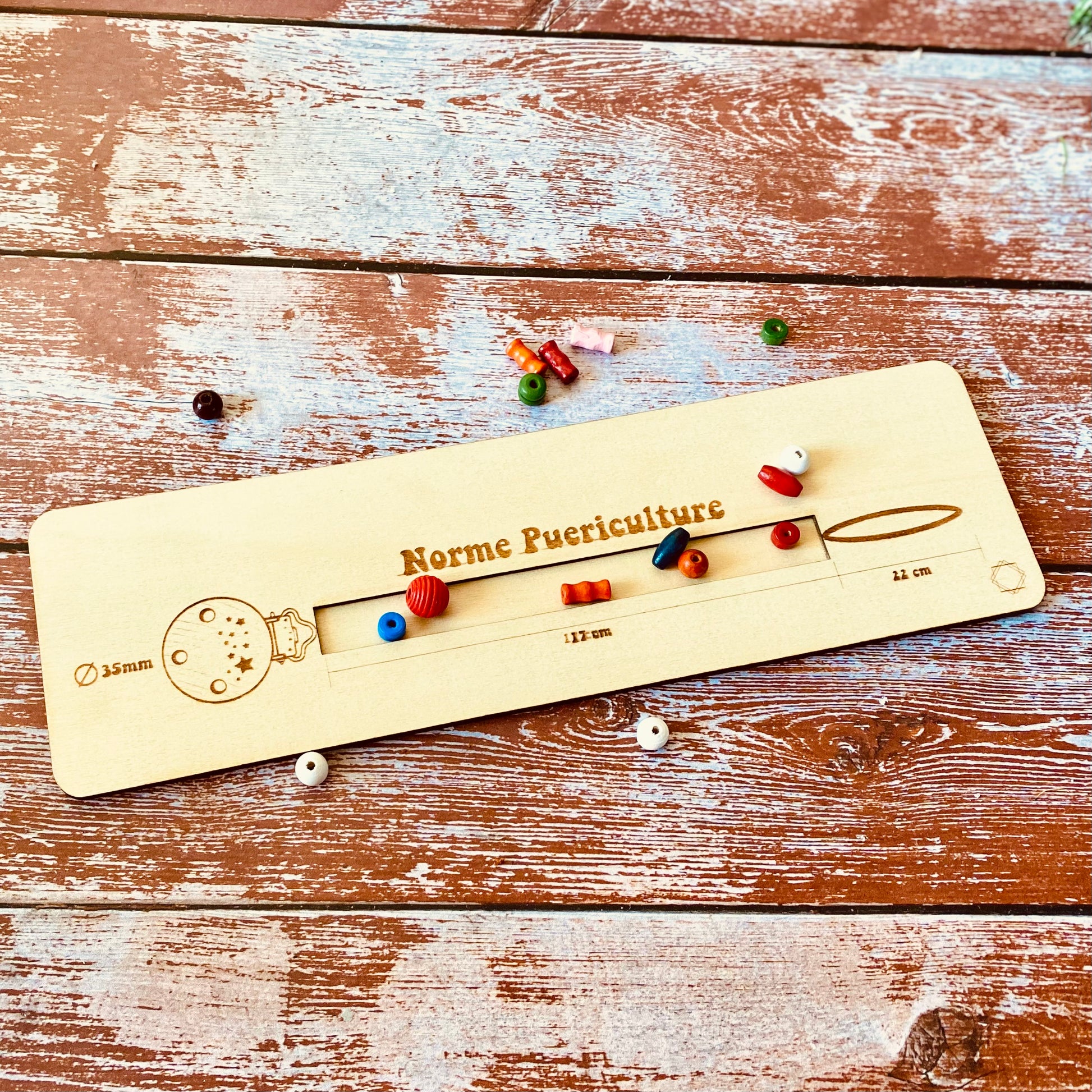 Cette planche gabarit en bois est l’outil indispensable pour toutes les créatrices et créateurs d’attaches-tétines conformes à la norme de puériculture EN 12586.