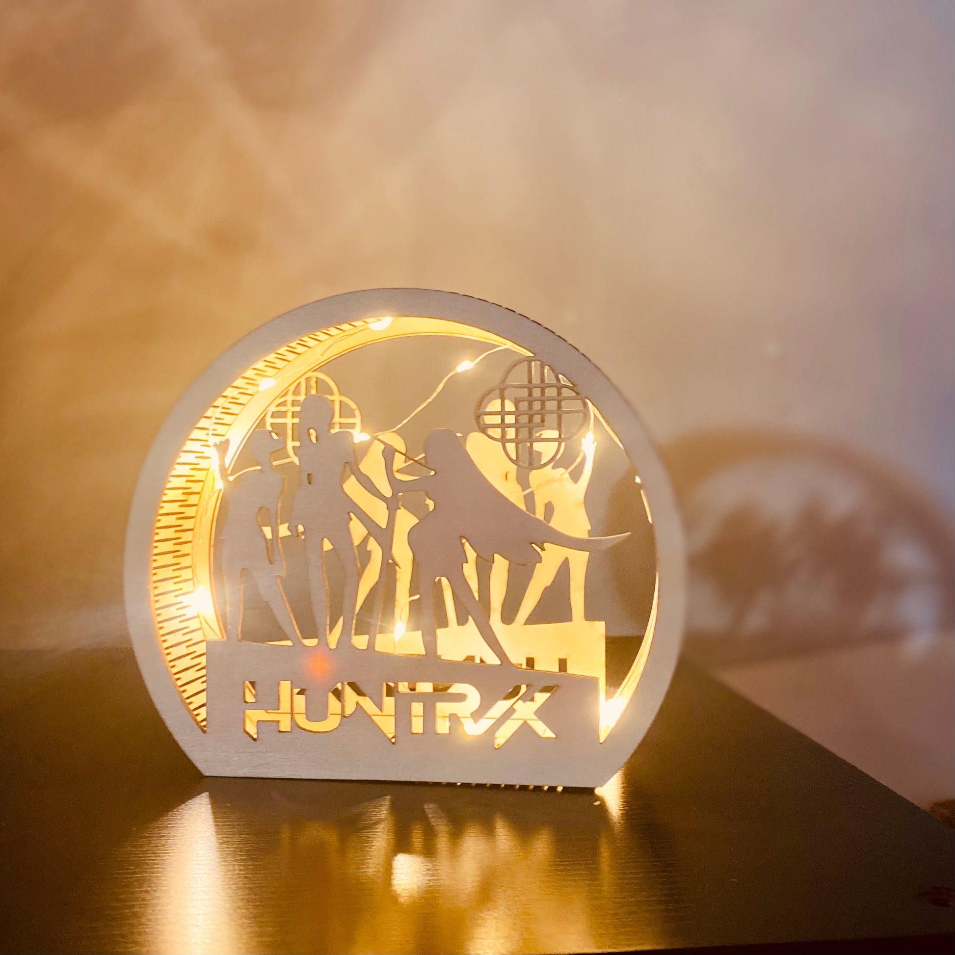 Découpée au laser dans un bois fin de 2,5 mm, cette lampe met en valeur des silhouettes stylisées inspirées d’un univers futuriste, sublimées par une lumière LED douce et chaleureuse.