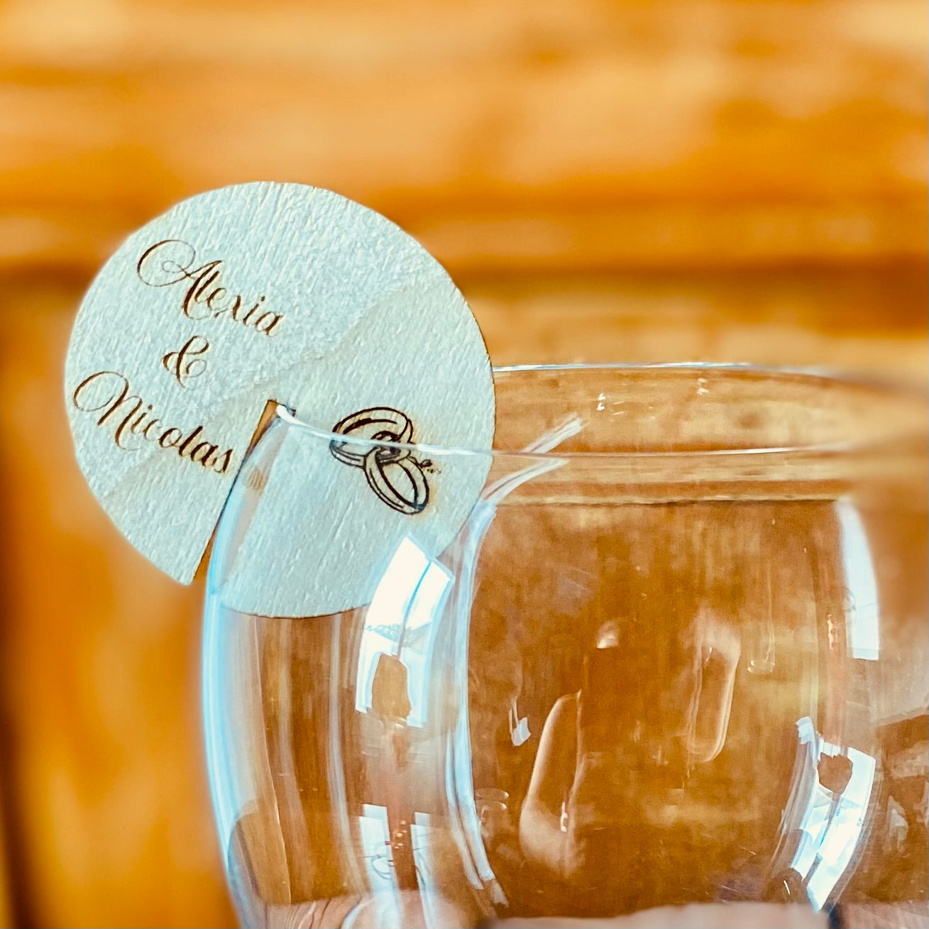 Sublimez vos tables de mariage avec nos marque-places en forme de cercle découpés et gravés dans du bois de tilleul naturel.