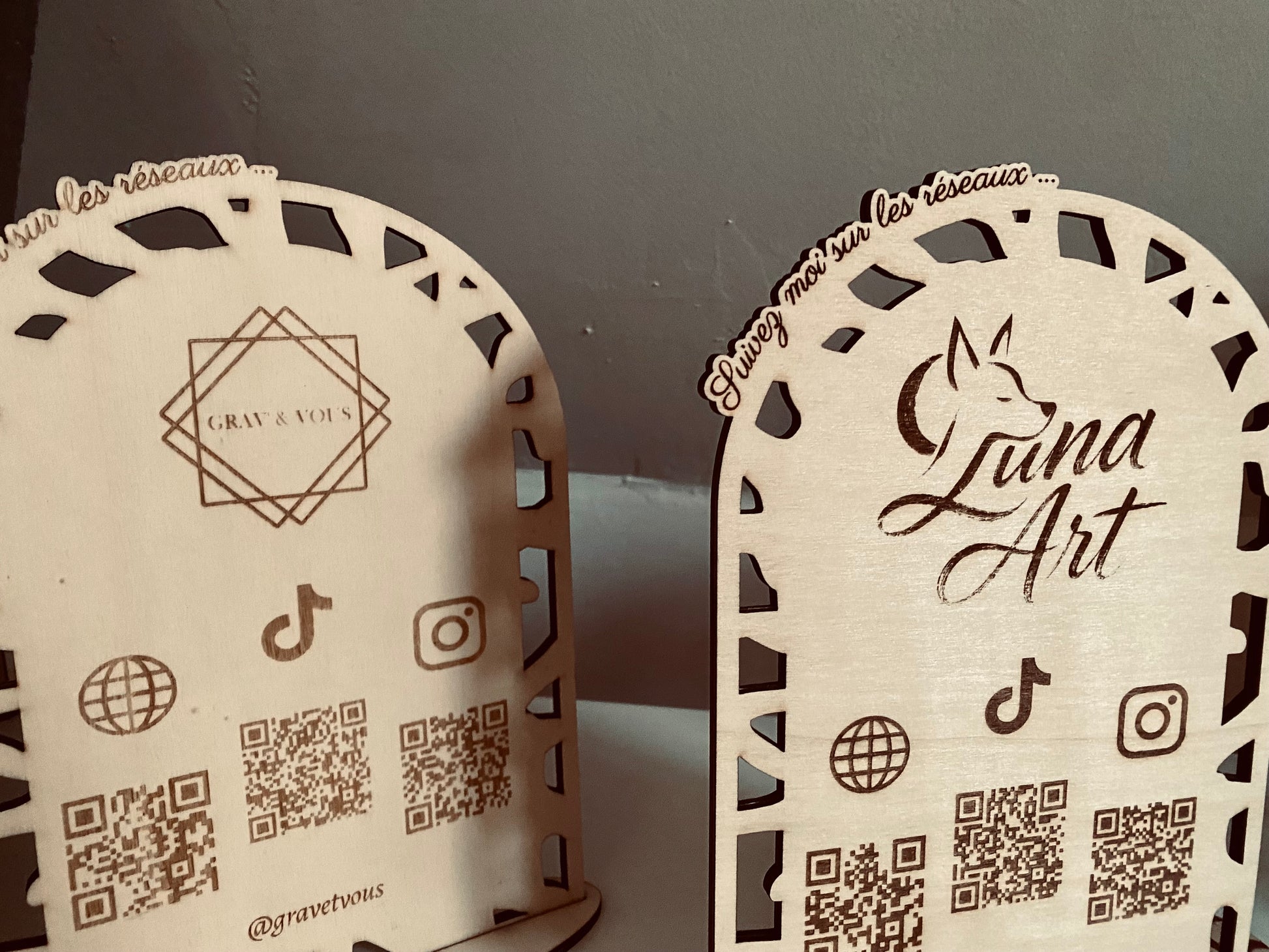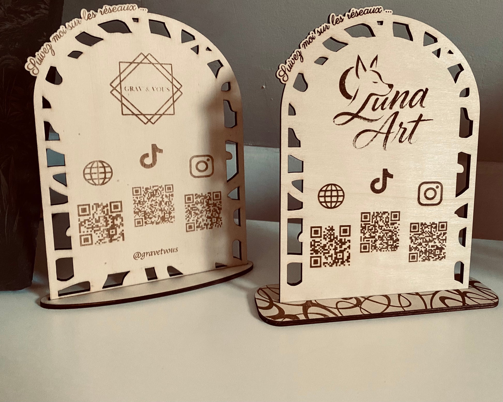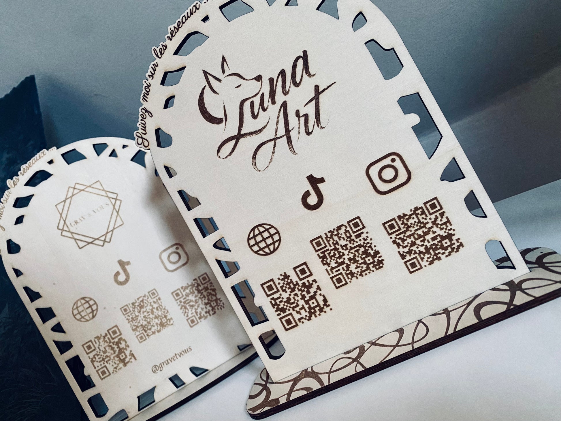 Ce support en bois gravé au laser permet de retrouver tous vos réseaux en un scan : site web, Instagram, TikTok…