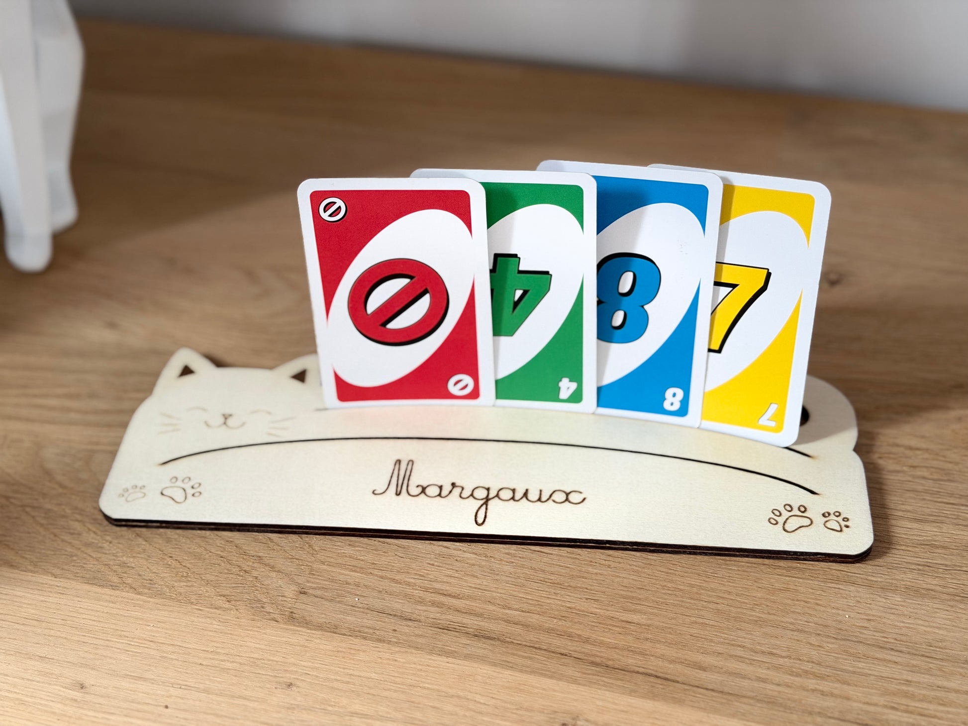Fabriqué en bois et gravé au prénom de l’enfant, ce support de cartes est à la fois pratique, ludique et durable. Idéal pour les jeux de cartes classiques comme le Uno, la bataille, le 7 familles ou tout autre jeu nécessitant de tenir plusieurs cartes.