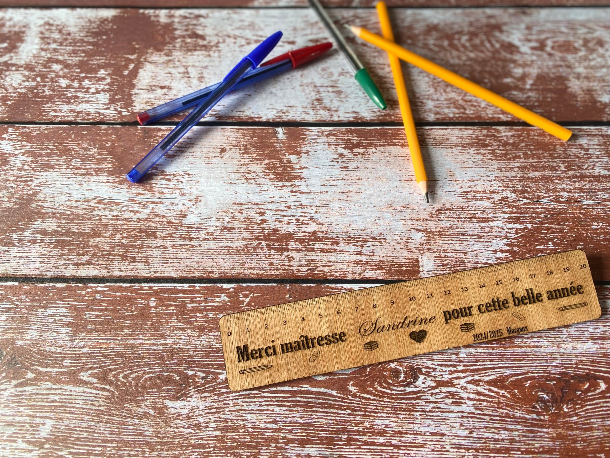 Dites merci avec originalité ! Cette règle en bois, découpée et gravée au laser, est bien plus qu’un simple outil de mesure : c’est un joli clin d'œil à celles et ceux qui accompagnent les enfants tout au long de l’année. Personnalisée avec soin, elle devient un cadeau unique, à la fois utile, symbolique et plein de tendresse.