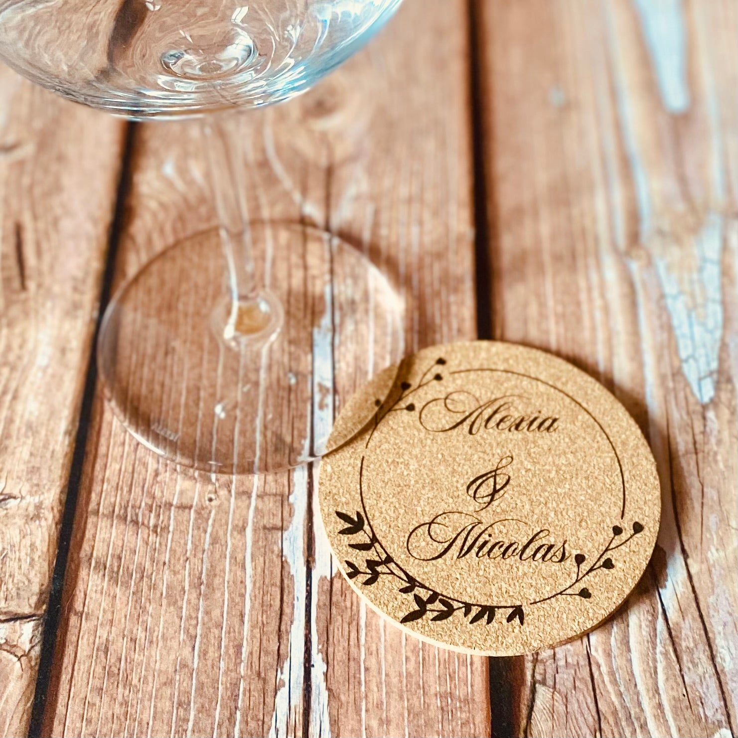 Chaque sous-verre est réalisé en liège naturel (diamètre 9 cm, épaisseur 3 mm) et peut être personnalisé avec vos prénoms, une date, ou un mot spécial.