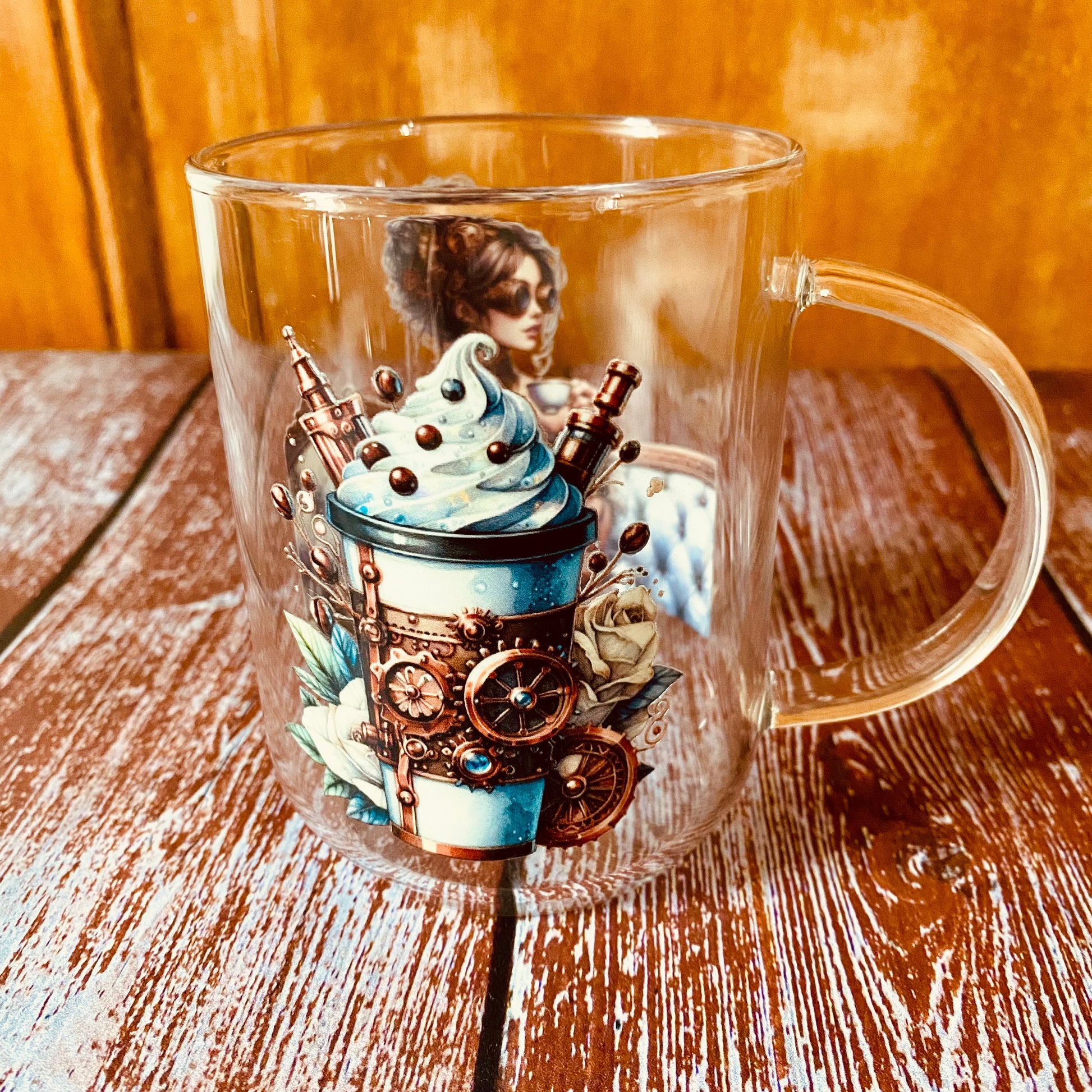 Plongez dans l’univers rétro-futuriste avec cette tasse en verre borosilicate au design steampunk unique.