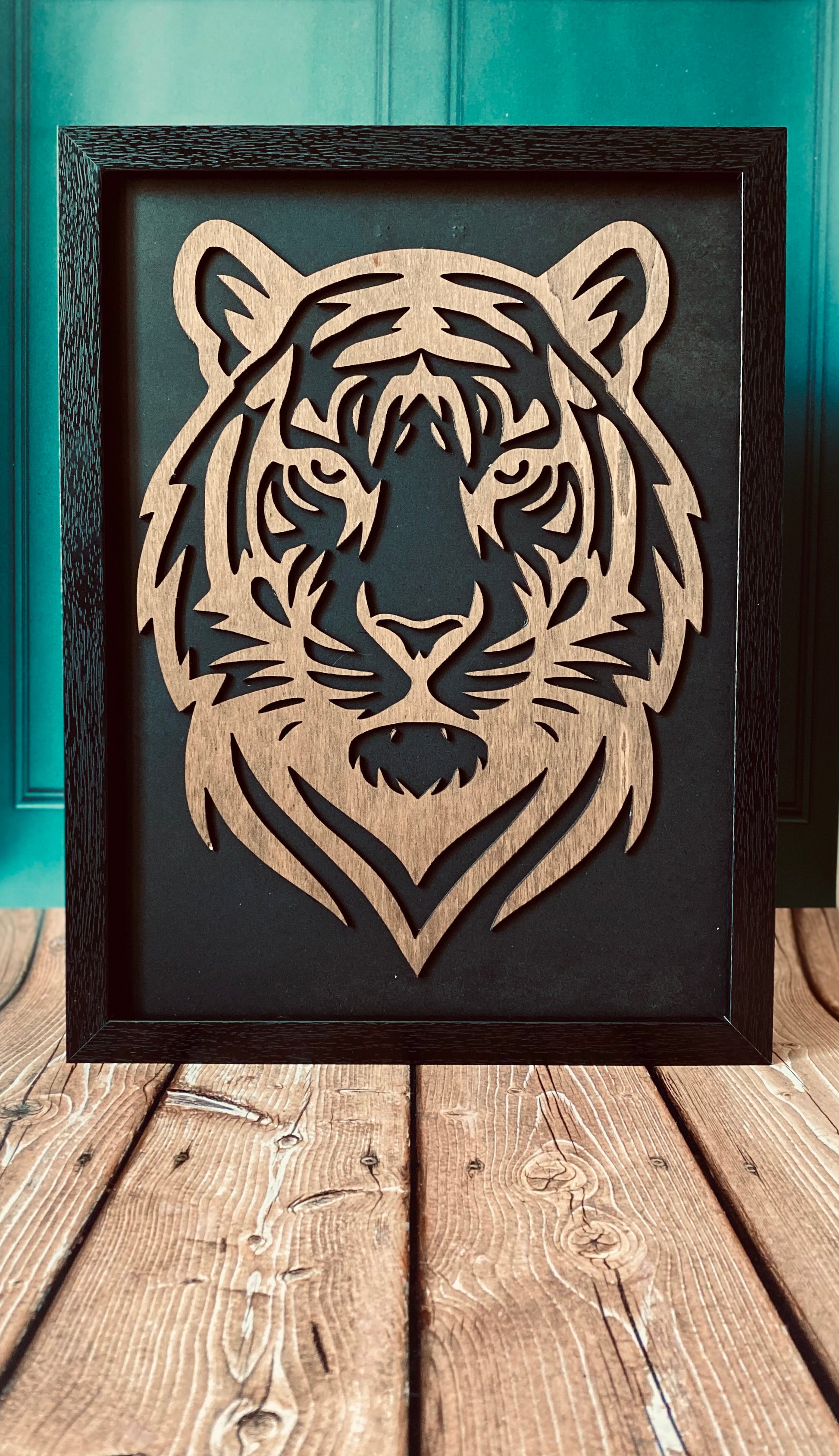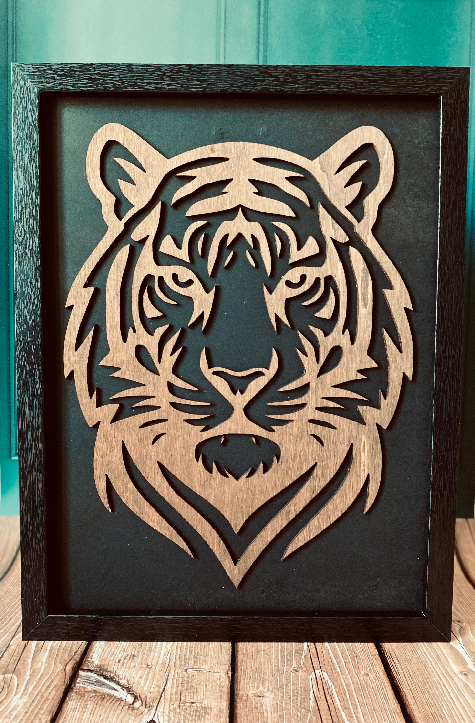 Cette œuvre unique représente une tête de tigre stylisée, découpée avec précision dans du bois de peuplier de 3 mm. Réalisée au format A3 (29,7 x 42 cm), chaque pièce est encadrée dans un cadre noir sobre qui met en valeur les détails du bois clair.