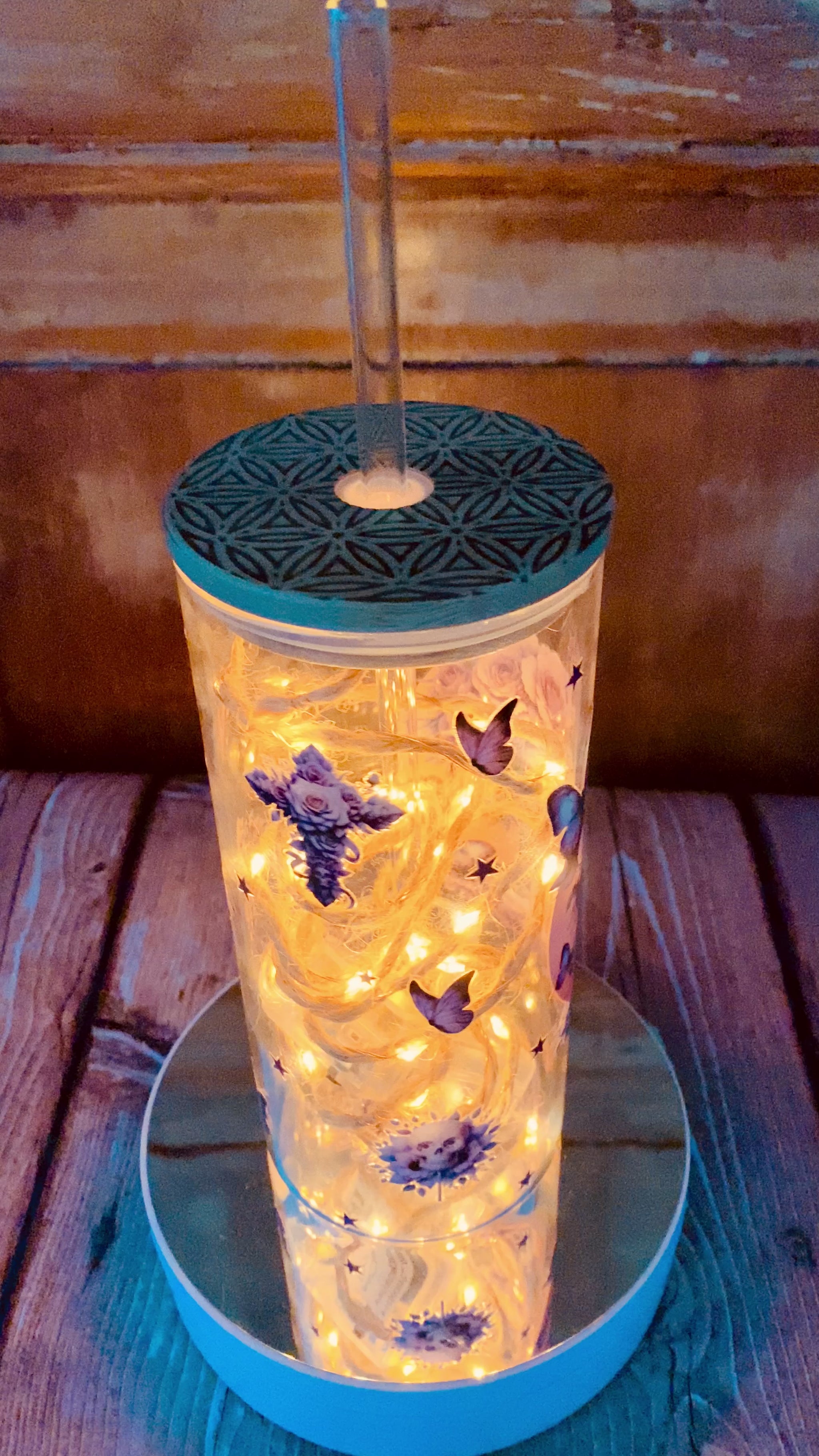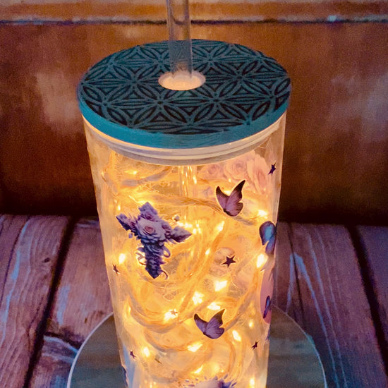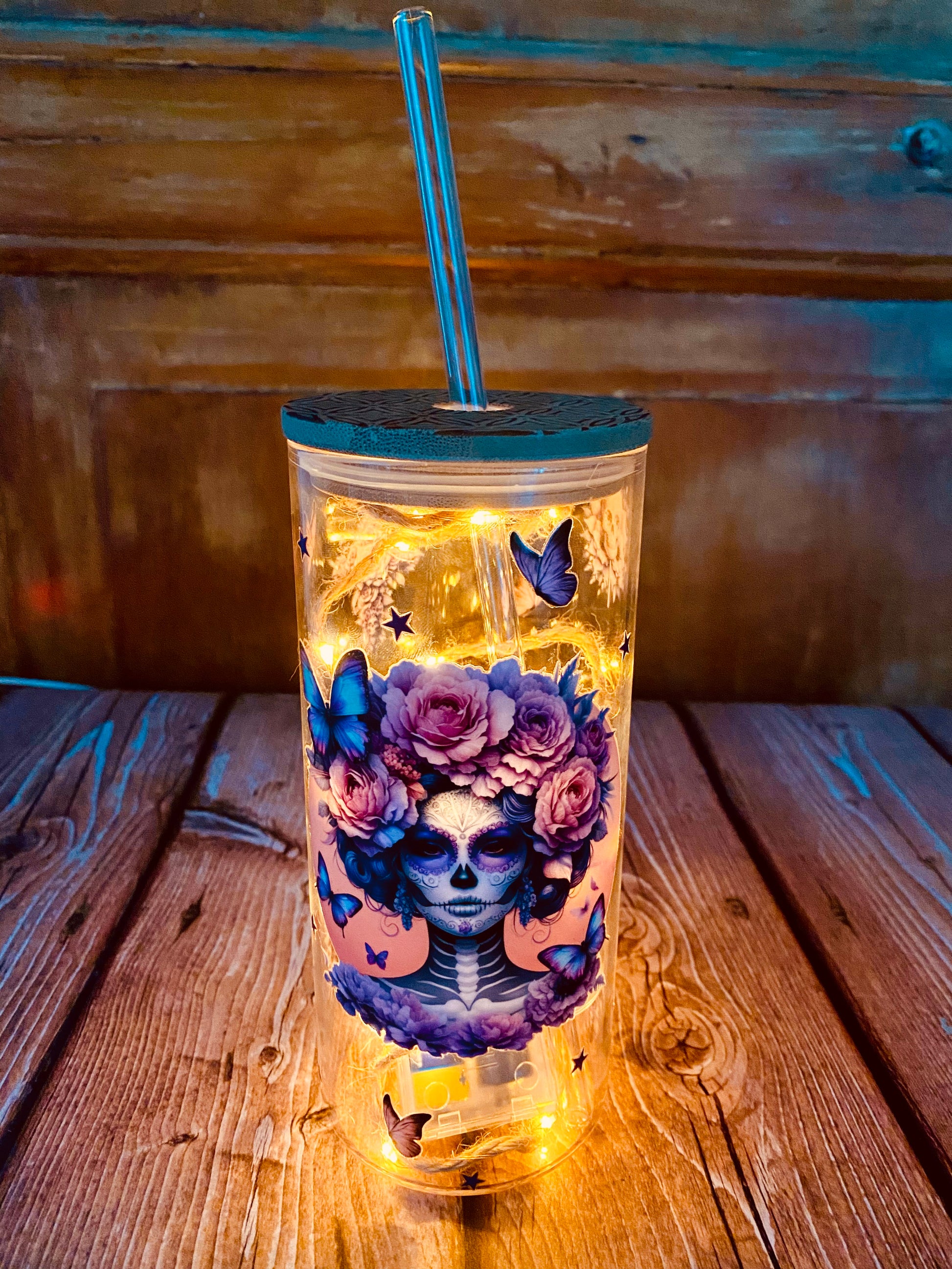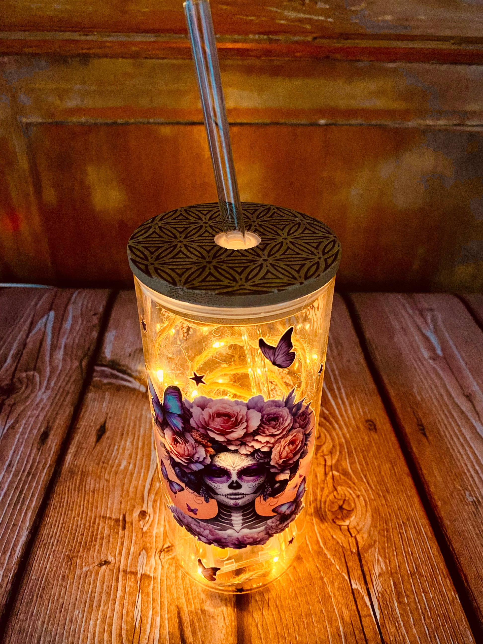 ✨ Ce verre en borosilicate de 600 ml est orné d’une figure calavera entourée de fleurs et de papillons, symbole de renaissance et de beauté éphémère. Avec son couvercle en bois gravé au laser et sa paille en verre réutilisable, il associe style et durabilité.
